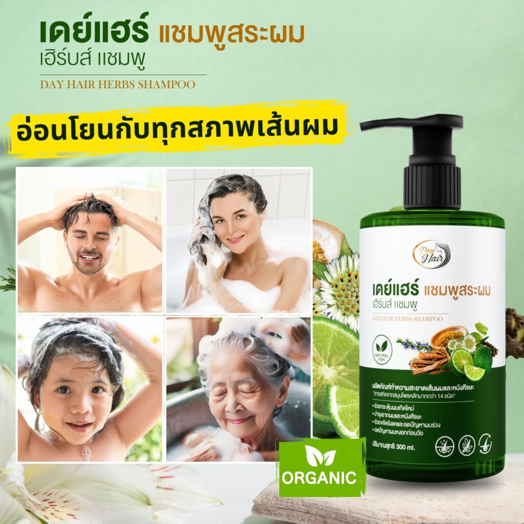 แชมพูสระผมสมุนไพร เดย์แฮร์ ประกอบด้วยสมุนไพรมากกว่า 14 ชนิด ลดการหลุดร่วง ผมบาง ผมมัน เชื้อรา รังแค ผมแห้งเสียแตกปลาย ปริมาณสุทธิ 300 ml.